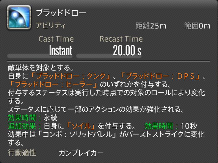 ブラッドキャストで発動できるスキルはどれも強力な代わり敵に突っ込んだら帰りは徒歩なのと、ビートファングのコンボを回さないといけないので、前に出てGCDを回しながら留まる必要があります。バーストの引き出しが多いのも特徴です。