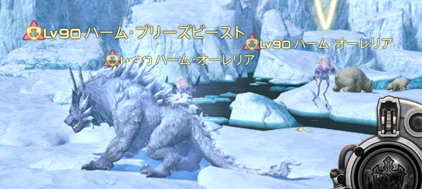 1グループ目でよくある3体配置です。大抵のジョブは3体以上で範囲攻撃の方がよくなりますが、釣ってさっさと移動するために1体目をロブ、GCD間に2体目に挑発、3体目をロブで釣りましょう。