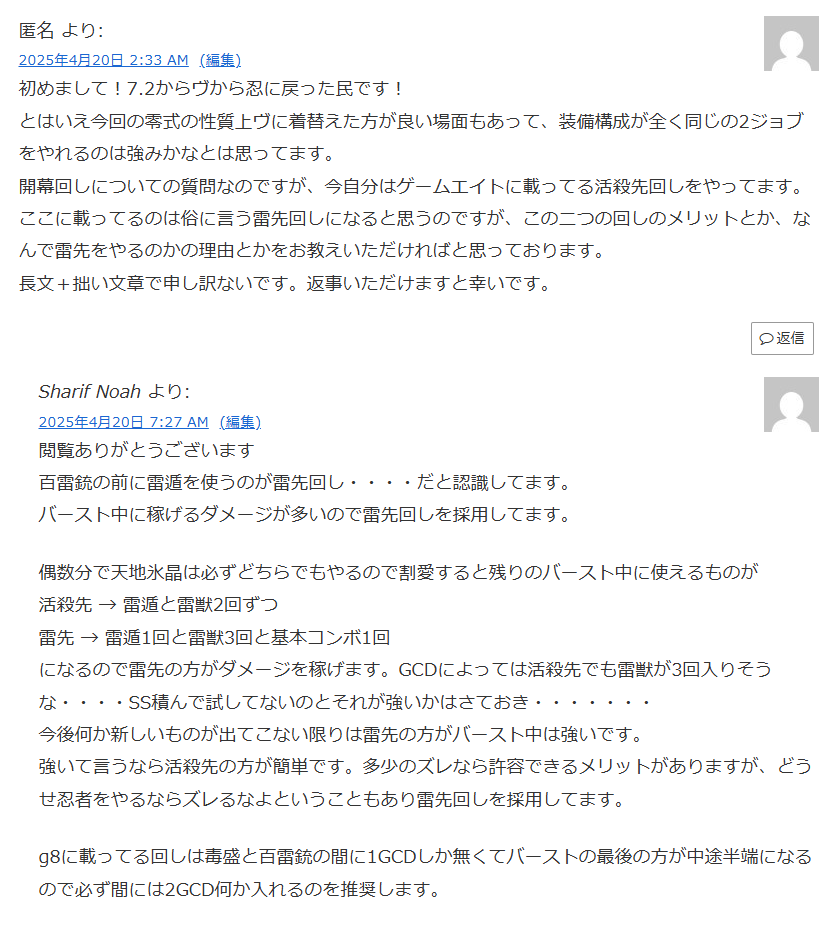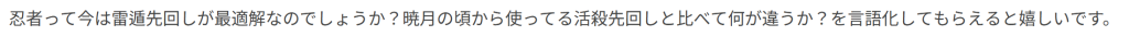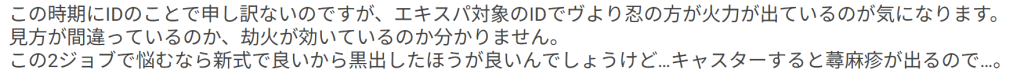 このおたよりを頂いてエキルレに忍者を出してみましたが、相変わらずめんどくさいだけで時間が変わらないならヴでいいよなぁと思いました。劫火滅却とか百雷銃とか天理人道とか威力イカツいのに減衰がついてなくて超強そうなんですけど結局単体火力は忍者なのでヴで楽するのがよいと思います。