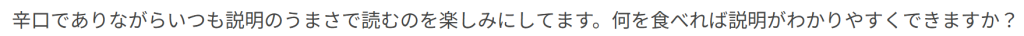 順番に言うだけです。口頭での説明ならブログのまとめにあたる部分を2回繰り返して言ったり、文字での説明なら何度も読み返したりします。このブログをいちばん読んでいるのはぼくです。辛口である自覚はないですが例えが独特と言われます。これを羨ましいと思う人が稀にいますが出来ることと出来ないことが違うだけで皆さんはぼくに出来ないことをたくさん出来ています。ぼくは正しい箸の持ち方で焼き魚をキレイに食べられません。