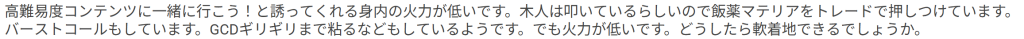 どうしようもないので本人からぼくにTwitterでDMを頂くのが手っ取り早いです。おめぇ結果出てねぇからこのオタクに聞いてこいよって言ってあげてください。アイコンが羊でヘッダーが鳥人間ですが大抵のことは答えられます。2層のインセインエアーでGCDが止まる現象をみんなが視線切りって呼んでる理由だけはわかりません。あれってそういうものなんですかね。