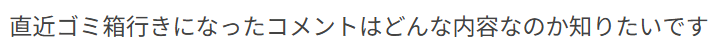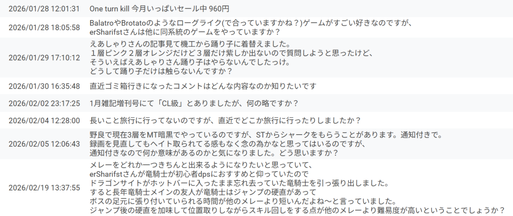 あとは極グラシャラボラスだったかヘビー級2層の所感に送られてきた「やめたら?」と「おめーのお気持ちの方がなげーよ」くらいでしょうか。イキり気味だったりキモめのコメントでも返す内容があれば承認しています。批判や指摘であればご指摘ありがとうございます修正しましたとか「はい!すいません!がんばります!」と返すので、人間である基準を満たしていないコメントがゴミ箱行きになります。