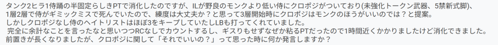 ぼくが野良で侍をやっていて踊り子が稀にクロポジをつけないことがあります。ピの方が開幕バーストが強いからとか竜は武器がIL495だからとか色々考えているんだろうと思います。1人で参加してるなら少なくとも合理的な考えがあってのことだろうとします。